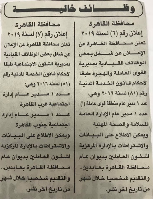 الاعلان الرسمي وظائف محافظة القاهرة اعلان 6 و7 لسنة 2019 التقديم الان