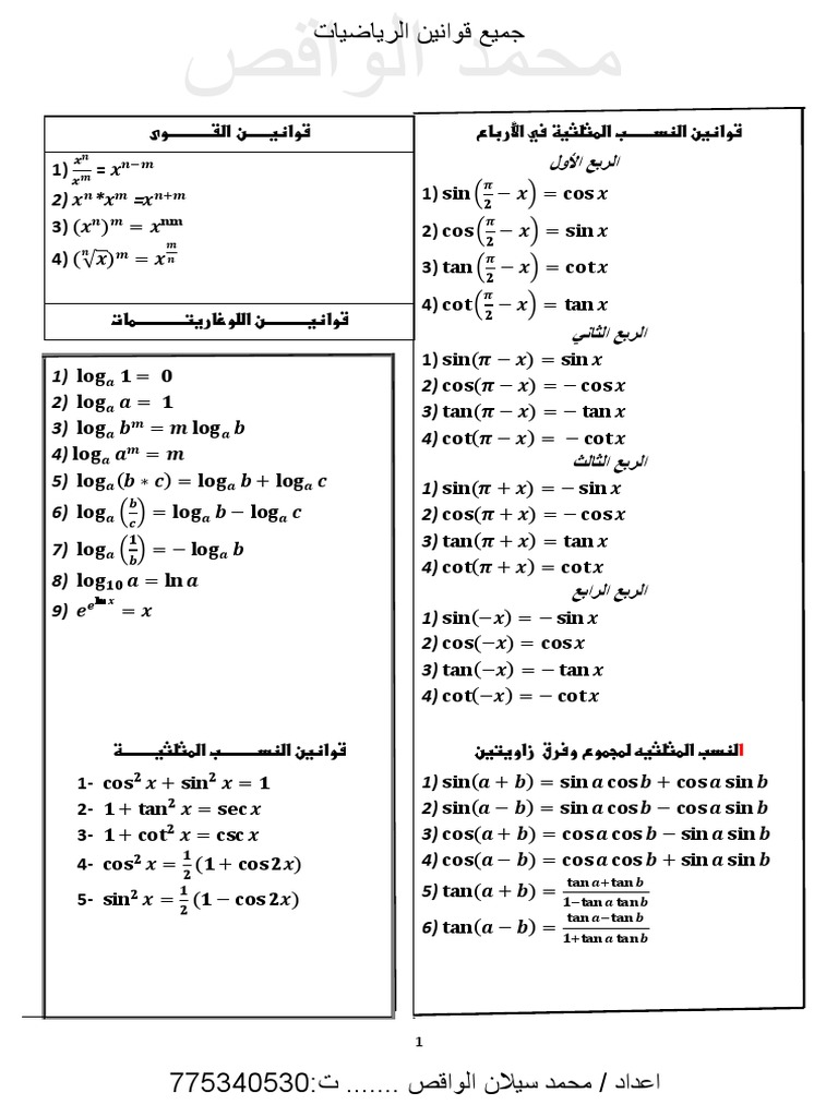 قوانين النسب المثلثية Pdf تحميل مباشر